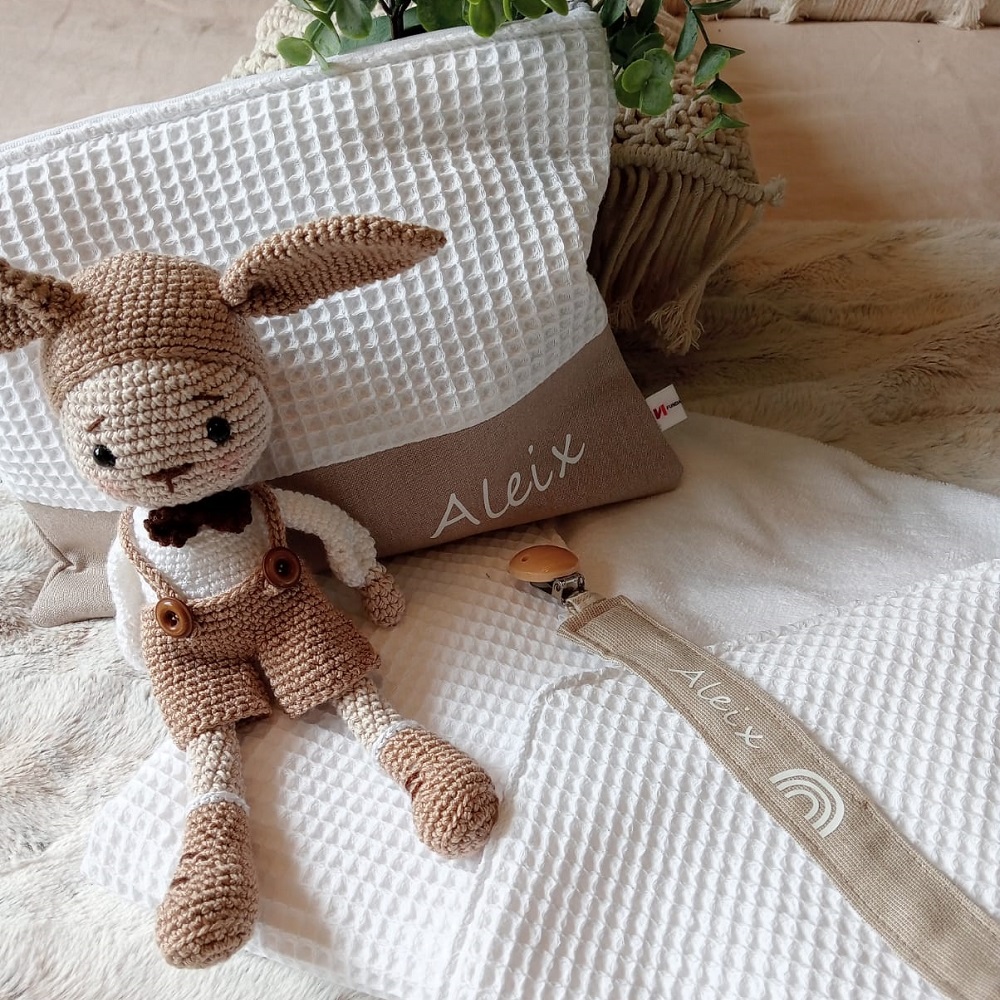 Neceser bebé en nido de abeja blanco combinado con tela beige